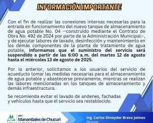 ¡Atención comunidad! Suspensión temporal del servicio de agua potable Les informamos que los días 12 y 13 de agosto de 2025, se realizará la suspensión del servicio de agua potable