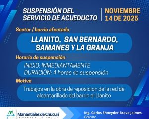 Informamos la suspensión temporal del servicio de acueducto para hoy, viernes 14 de noviembre de 2025. Sector Afectado: LLANITO, SAN BERNARDO, SAMANES Y LA GRANJA. Inicio: INMEDIATAMENTE Duración estimada: 4
