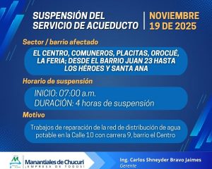 Informamos la suspensión temporal del servicio de acueducto para el día 19 de noviembre de 2025. Sector Afectado: EL CENTRO, COMUNEROS, PLACITAS, OROCUÉ, LA FERIA; DESDE EL BARRIO JUAN 23