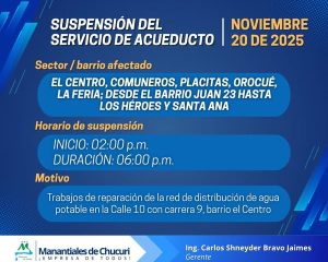 Informamos la suspensión temporal del servicio de acueducto para el día de hoy, 20 de noviembre de 2025. Sector Afectado: EL CENTRO, COMUNEROS, PLACITAS, OROCUÉ, LA FERIA; DESDE EL BARRIO