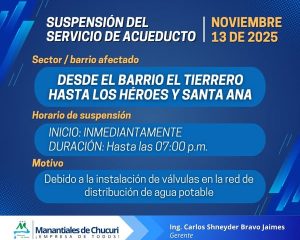 Informamos la suspensión temporal del servicio de acueducto del día de hoy, jueves 13 de noviembre de 2025. Sector Afectado: DESDE EL BARRIO EL TIERRERO HASTA LOS HÉROES Y SANTA