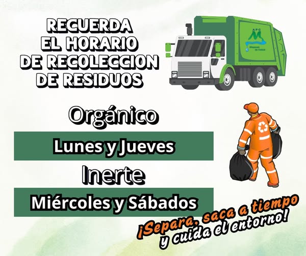 ¡Recuerda los días de recolección de residuos! 26 junio, 2025 Auxiliar Administrativo Noticias Residuos Orgánicos Lunes y Jueves A partir de las 6:00 a. m. Residuos Inertes Miércoles y Sábados A partir de las 6:00 a. m. ¡Saca tus residuos a tiempo y ayuda a mantener limpio nuestro municipio!APC MANANTIALES DE CHUCURÍ, ¡EMPRESA DE TODOS!