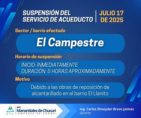 Informamos la suspensión temporal del servicio de acueducto hoy, 17 de julio de 2025, en en le barrio EL CAMPESTRE: