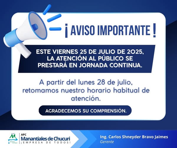 Informamos a nuestros usuarios que este viernes 25 de julio de 2025, la atención al usuario se realizará en jornada continua.