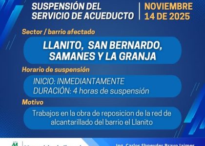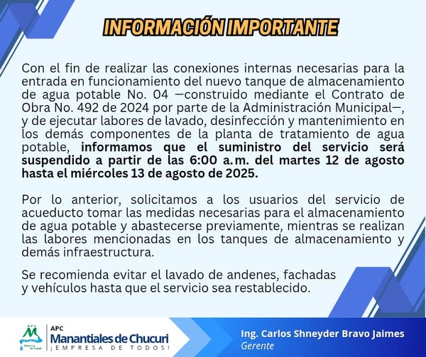 Les informamos que los días 12 y 13 de agosto de 2025, se realizará la suspensión del servicio de agua potable a partir de las 6:00 a. m. del 12 de agosto, debido a trabajos de conexión del nuevo tanque de almacenamiento No. 04 y mantenimiento en la planta de tratamiento.