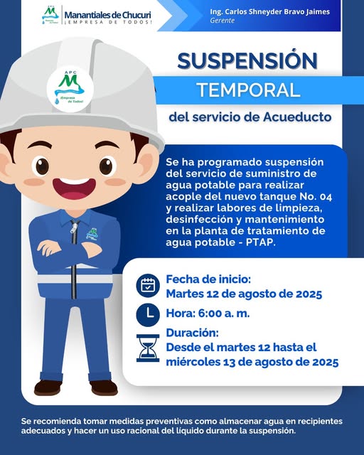 Con el fin de poner en operación el nuevo tanque de almacenamiento de agua potable No. 04 y realizar labores de limpieza, desinfección y mantenimiento en la planta de tratamiento, será necesario suspender el suministro de agua en el municipio.