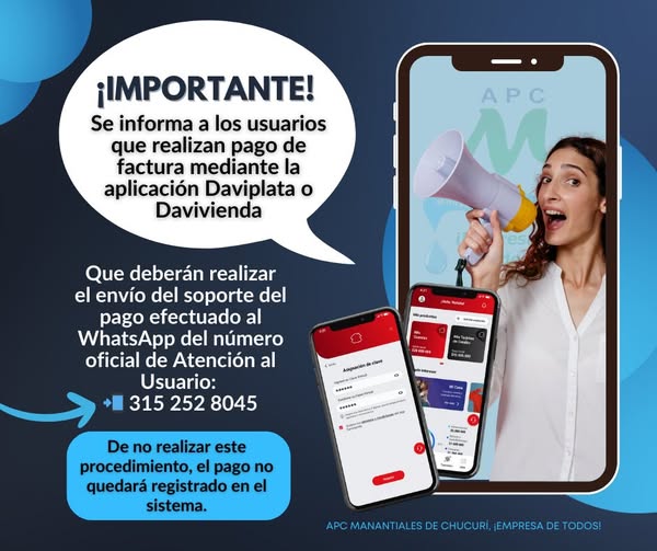 Informamos que los pagos de facturas realizados mediante la aplicación Daviplata o Davivienda deben ir acompañados del envío del soporte digital al WhatsApp oficial de Atención al Usuario: