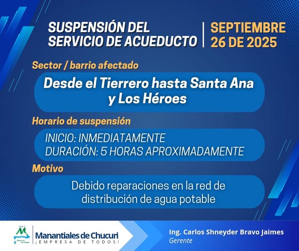 Informamos la suspensión temporal del servicio de acueducto hoy, 26 de septiembre de 2025.
