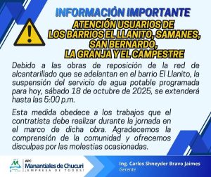 Informamos a la comunidad del barrio El Llanito, Samanes, San Bernardo, La Granja y El Campestre que, debido a las obras de reposición de la red de alcantarillado que se están ejecutando en el sector, la suspensión del servicio de agua potable programada para hoy sábado 18 de octubre de 2025 se extenderá hasta las 5:00 p.m.