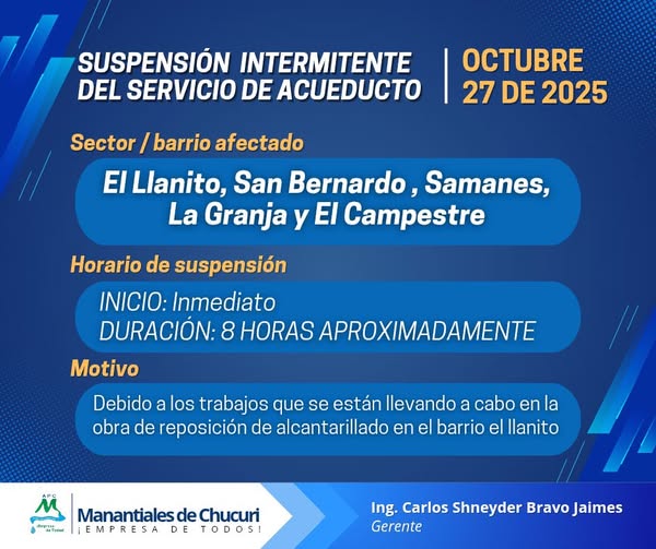 Informamos la suspensión temporal del servicio de acueducto para hoy, lunes 27 de octubre de 2025.