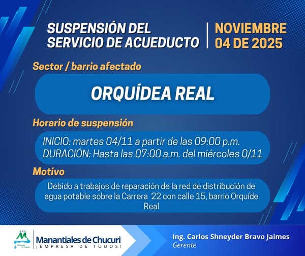 Informamos la suspensión temporal del servicio de acueducto iniciando el día de hoy, martes 04 de noviembre de 2025.