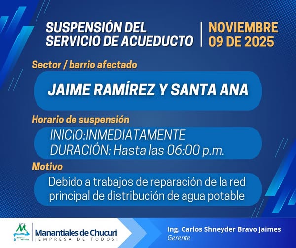 Informamos la suspensión temporal del servicio de acueducto del día de hoy, domingo 09 de noviembre de 2025.