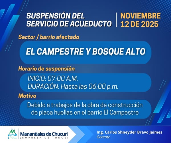 Informamos de la suspensión temporal del servicio de acueducto para el día MIÉRCOLES 12 DE NOVIEMBRE DE 2025.