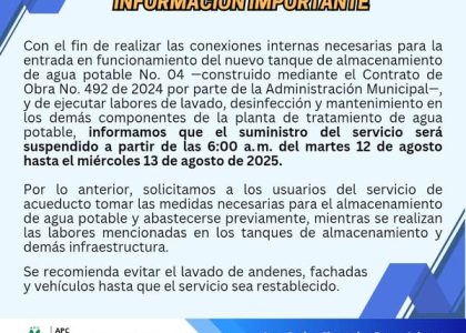 Agradecemos su comprensión y recomendamos tomar las medidas necesarias para el abastecimiento de agua durante este tiempo.