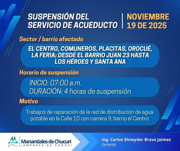 Informamos la suspensión temporal del servicio de acueducto para el día 19 de noviembre de 2025.