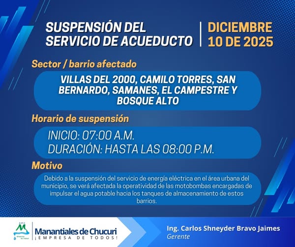 Informamos la suspensión temporal del servicio de acueducto para el día de mañana, miércoles 10 de diciembre de 2025.