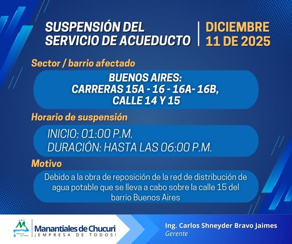 Informamos la suspensión temporal del servicio de acueducto para el día de hoy, jueves 11 de diciembre de 2025.