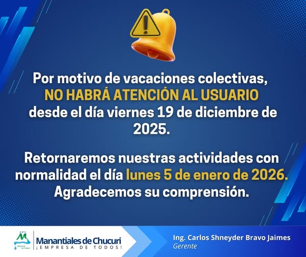 Con el fin de informar oportunamente a la comunidad, el área administrativa de APC Manantiales de Chucurí estará en vacaciones colectivas a partir del jueves 19 de diciembre de 2025, por lo cual no habrá atención al usuario durante este periodo.