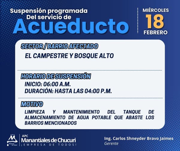 Este miércoles 18 de febrero de 2026 se realizará una suspensión del servicio de acueducto, así: