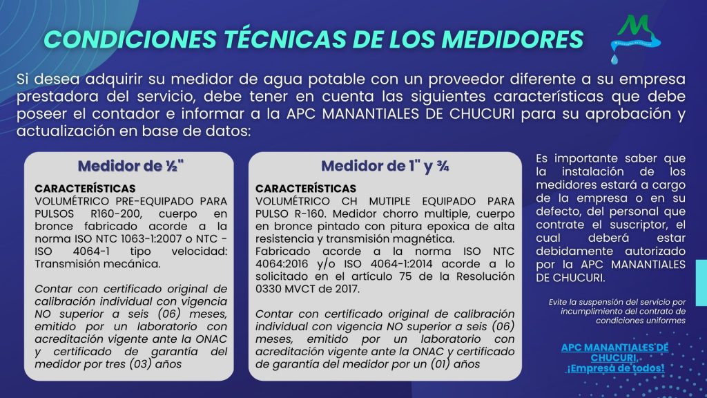 Informamos a la comunidad en general sobre las CONDICIONES TÉCNICAS que deben tener los MEDIDORES que sean adquiridos por los suscriptores en sitios diferentes a la APC MANANTIALES DE CHUCURI.