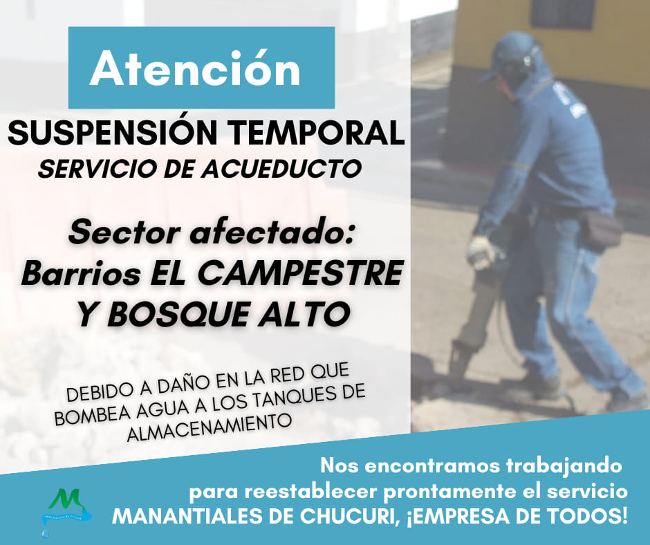 Se informa a los usuarios de los barrios mencionados que debido a daño en la red que bombea el agua potable a los tanque de Almacenamiento se debió SUSPENDER de manera TEMPORAL el servicio de ACUEDUCTO.
