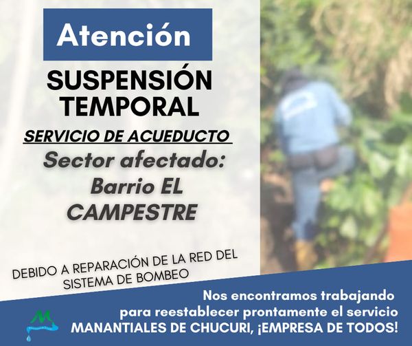 SUSPENSIÓN TEMPORAL DEL SERVICIOS DE ACUEDUCTO – BARRIO EL CAMPESTRE 23 febrero, 2023 Auxiliar Administrativo Noticias Facebook