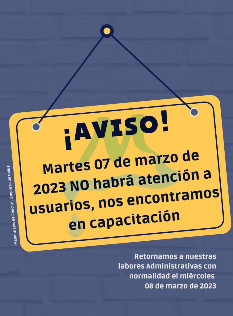 INFORMAMOS A TODOS NUESTROS USUARIOS QUE POR POR TEMAS DE CAPACITACIÓN AL PERSONAL DEL ÁREA ADMINISTRATIVA DE LA EMPRESA, NO HABRÁ ATENCIÓN A USUARIOS EL DÍA MARTES 06 DE MARZO DE 2023