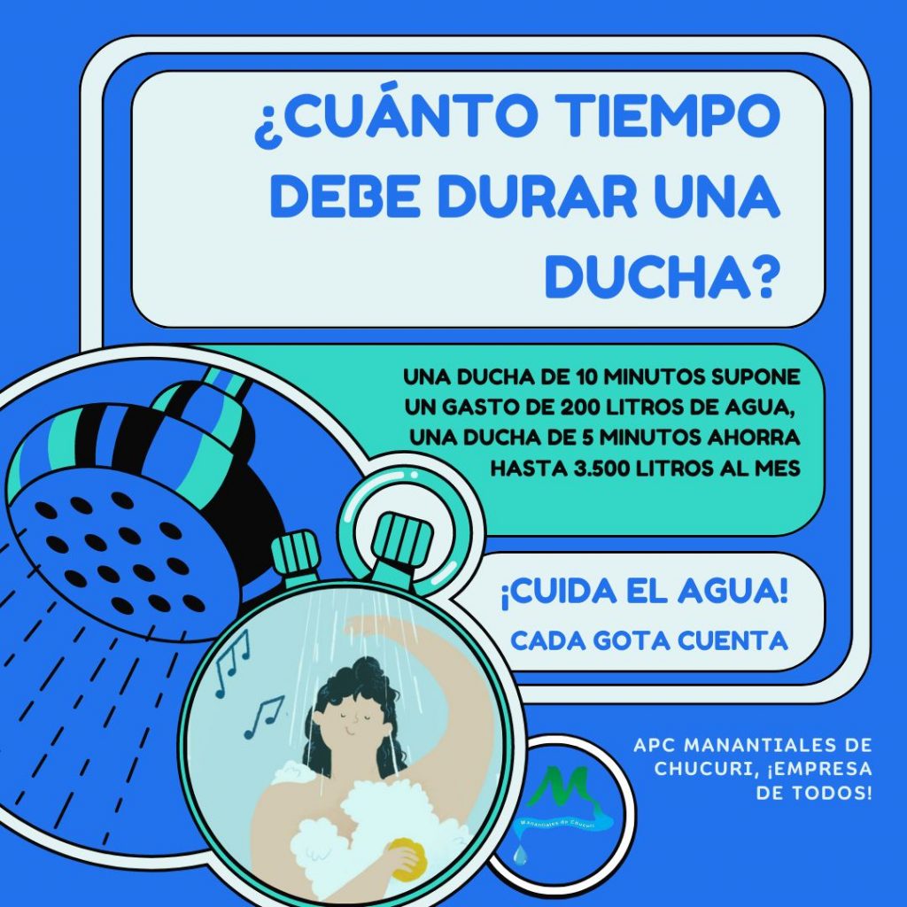 Para ahorrar aún más agua, mantenga la ducha por debajo de 5 minutos. ¡Intenta sincronizarte con un reloj la próxima vez que uses la ducha! ¡o báñate en lo que dura una de tus canciones favoritas!