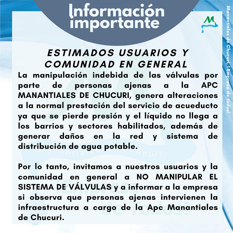 Informa a nuestras líneas de atención a usuarios si observas que personas ajenas a la Apc Manantiales de Chucuri hacen uso indebido nuestra infraestructura.