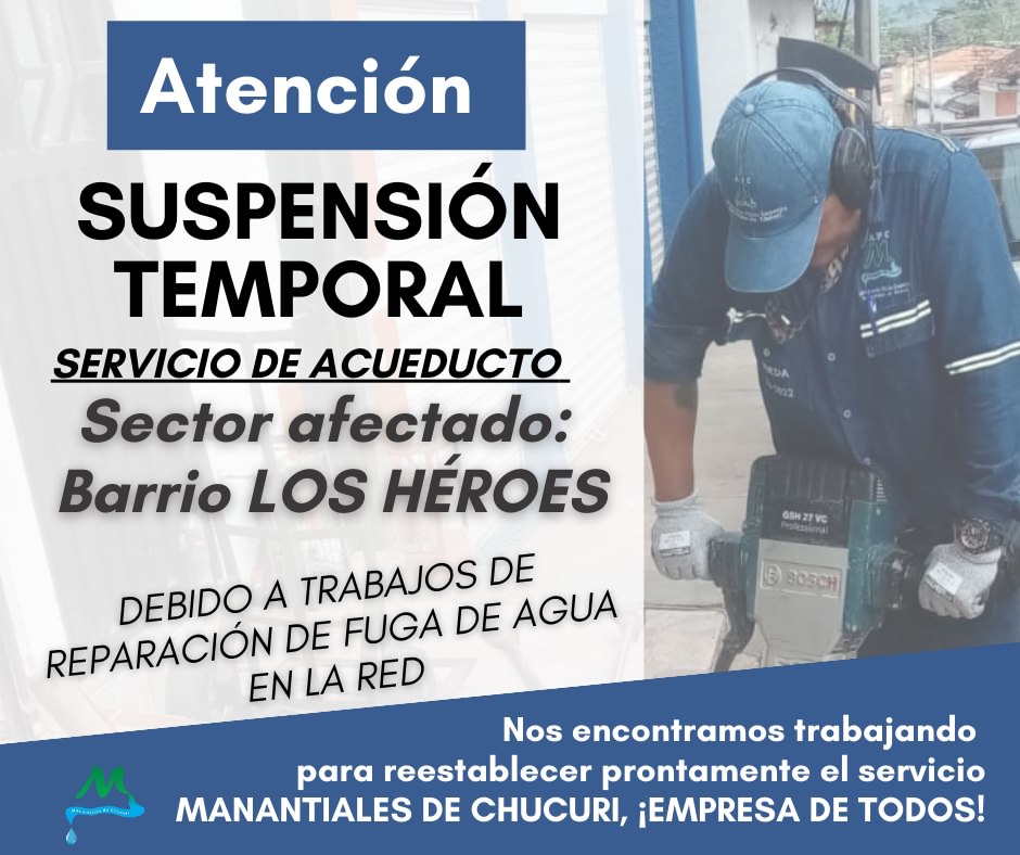 Informamos a los usuarios del servicio de ACUEDUCTO del barrio LOS HÉROES que la suspensión del servicio debido a trabajos de imprevisto de reparación de fuga en la red del servicio, se ampliará hasta el medio día de hoy y se realizará suspensión nuevamente en horas de la tarde, por tanto, se recomienda realizar el adecuado abastecimiento