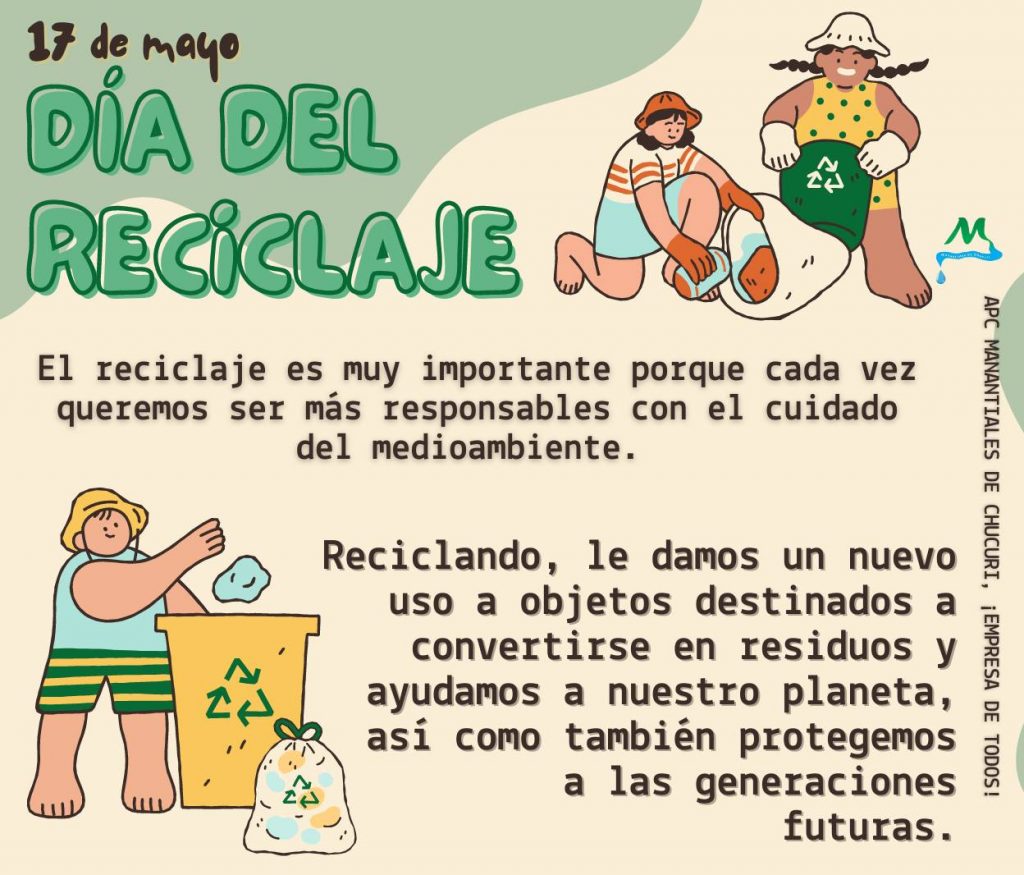 Hoy 17 DE MAYO se celebra EL DÍA DEL ECICLAJE, fecha establecida por la Unesco con la intención recordar la importancia del cuidado del planeta a través de una adecuada gestión de los residuos y el desarrollo de políticas de acción comprometidas con el cuidado del ambiente.