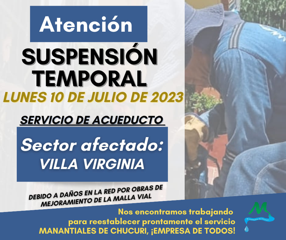SUSPENSIÓN TEMPORAL – BARRIO VILLA VIRGINIA 11 julio, 2023 Auxiliar Administrativo Noticias SUSPENSIÓN TEMPORAL DEL SERVICIO DE ACUEDUCTOSector afectado: Barrio VILLA VIRGINIAHorario: 09:00 am a 11:00 am02:00 pm a 05:00 pmHOY, LUNES 10 DE JULIO DE 2023.Causa: Debido a reparaciones en la red de suministro de agua potable en el sector mencionado. Facebook