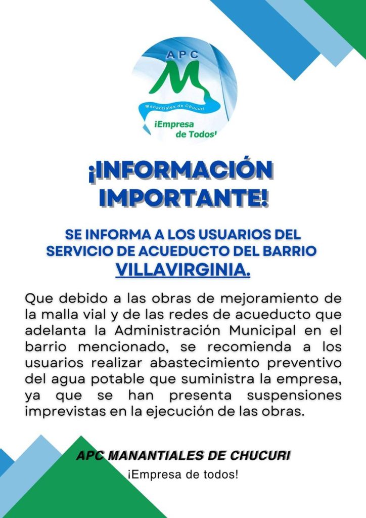 INFORMACIÓN DE INTERÉS PARA LOS USUARIOS DEL SERVICIO DE ACUEDUCTO DEL BARRIO VILLAVIRGINIA