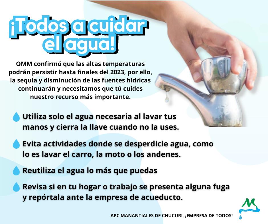 Este año, Colombia sigue atenta y preparándose para enfrentar el fenómeno climático El Niño, el cual se caracteriza por el calentamiento de las aguas del Océano Pacífico ecuatorial y La Organización Meteorológica Mundial OMM confirmó que las altas temperaturas podrán persistir hasta finales del 2023, por ello, la sequía y disminución de las fuentes hídricas continuarán y necesitamos que tú cuides nuestro recurso más importante.