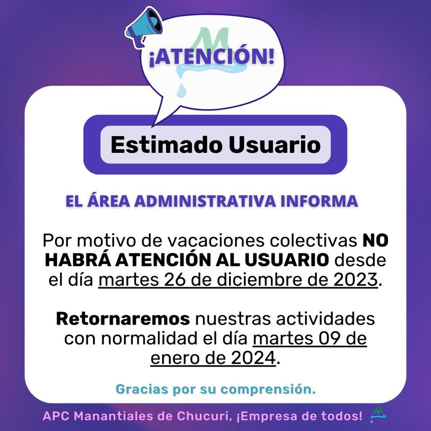 NO HABRÁ ATENCIÓN AL USUARIO A PARTIR DEL DÍA 26 DE DICIEMBRE DE 2023. 15 diciembre, 2023 Auxiliar Administrativo Noticias Facebook Instagram