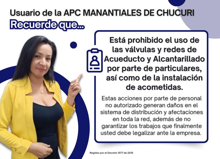 Por lo tanto, te invitamos a denunciar si observas a personas diferentes a los trabajadores de la APC MANANTIALES DE CHUCURI manipulando válvulas o las redes de distribución de agua potable, ya que esto está prohibido.