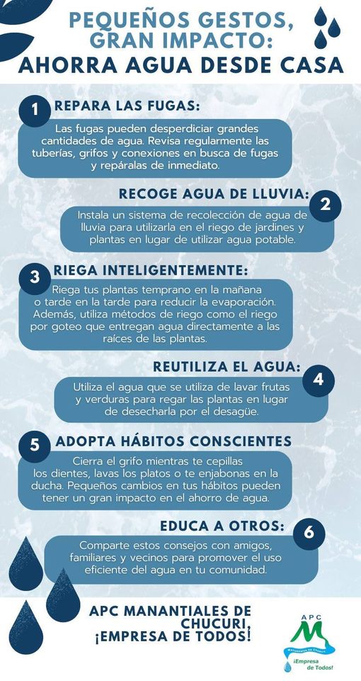 El ahorro y uso eficiente del agua es fundamental para cuidar nuestro planeta. 27 mayo, 2024 Auxiliar Administrativo Noticias Pequeñas acciones, como cerrar bien los grifos, reparar las fugas y utilizar tecnologías más eficientes, pueden marcar la diferencia.APC MANANTIALES DE CHUCURI, ¡EMPRESA DE TODOS!#Acueducto #alcantarillado #aseo