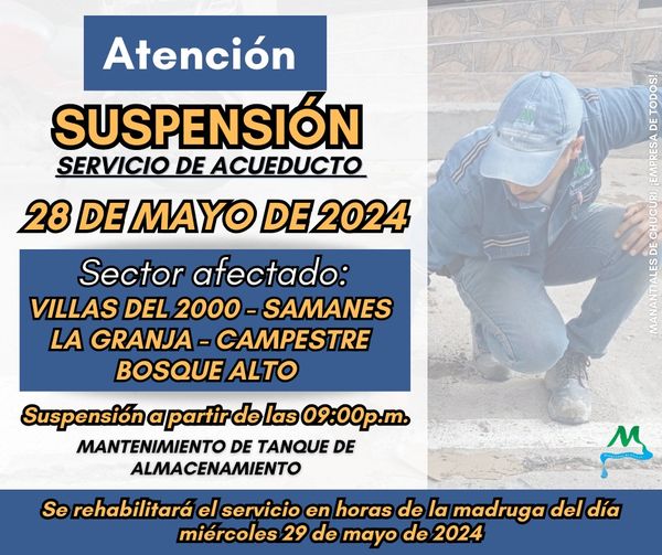 INFORMACIÓN IMPORTANTE: SUSPENSIÓN TEMPORAL DEL SERVICIO DE ACUEDUCTO.