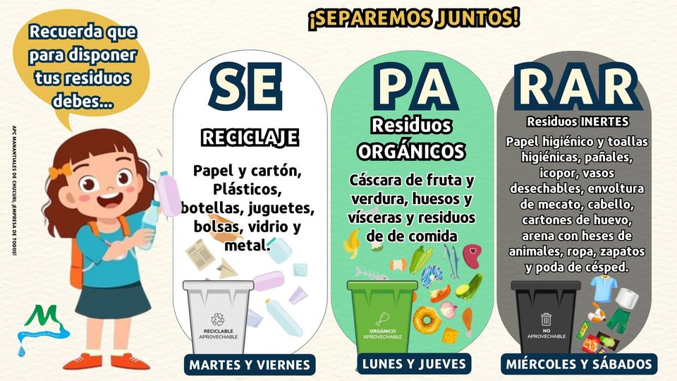 Recuerda clasificar tus desechos en orgánicos, inertes y reciclaje, de esta manera, contribuimos a disminuir la cantidad de residuos generados y ayudamos al medio ambiente.