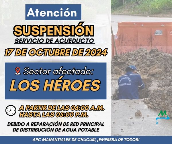 Suspensión temporal del servicio de acueducto: ¡Atención usuarios del barrio LOS HÉROES! 16 octubre, 2024 Auxiliar Administrativo Noticias Jueves 17 de octubre de 2024. A partir de las 06:00 a.m. hasta las 05:00 p.m. Barrio los Héroes. La suspensión del servicio se dará por la realización de trabajos de reparación de la red principal de distribución de agua potable en la calle 15 A. MANANTIALES DE CHUCURI, ¡EMPRESA DE TODOS! #Acueducto #alcantarillado #aseo