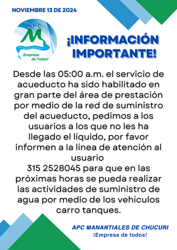 Desde las 05:00 a.m. el servicio de acueducto ha sido habilitado en gran parte del área de prestación por medio de la red de suministro del acueducto, pedimos a los usuarios a los que no les ha llegado el líquido, por favor informen a la línea de atención al usuario 315 2528045 para que en las próximas horas se puedan realizar las actividades de suministro de agua por medio de los vehículos carro tanques.