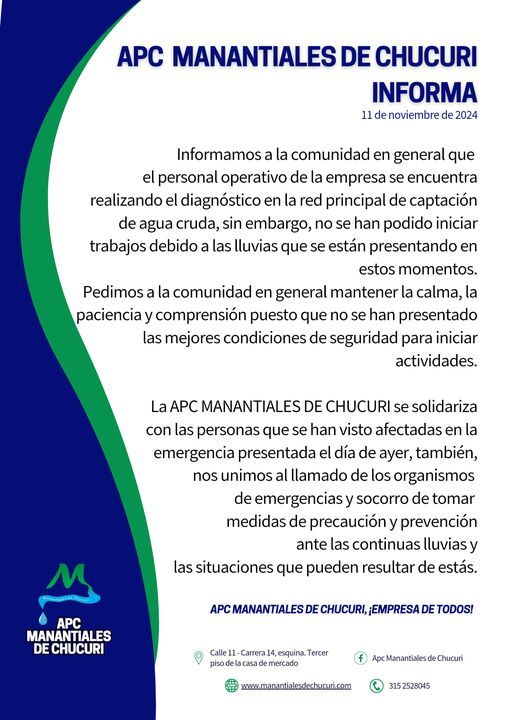 La APC MANANTIALES DE CHUCURI se solidariza con las personas que se han visto afectadas en la emergencia presentada el día de ayer, también, nos unimos al llamado de los organismos de emergencias y socorro de tomar medidas de precaución y prevención ante las continuas lluvias y las situaciones que pueden resultar de estás.