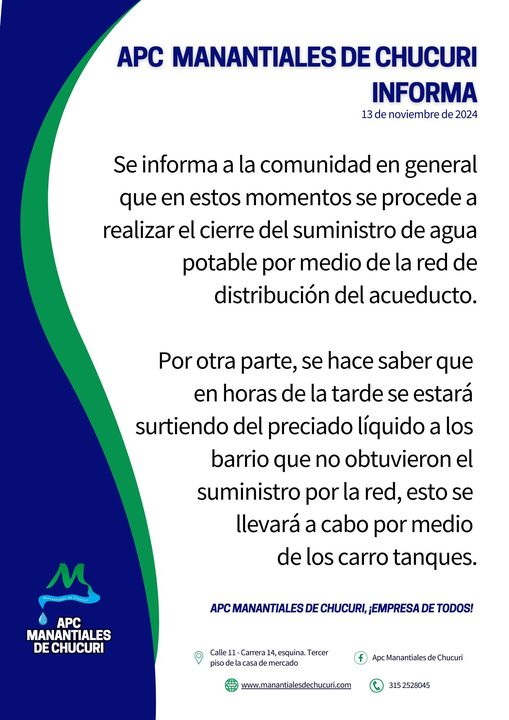 Se informa a la comunidad en general que en estos momentos se procede a realizar el cierre del suministro de agua potable por medio de la red de distribución del acueducto.