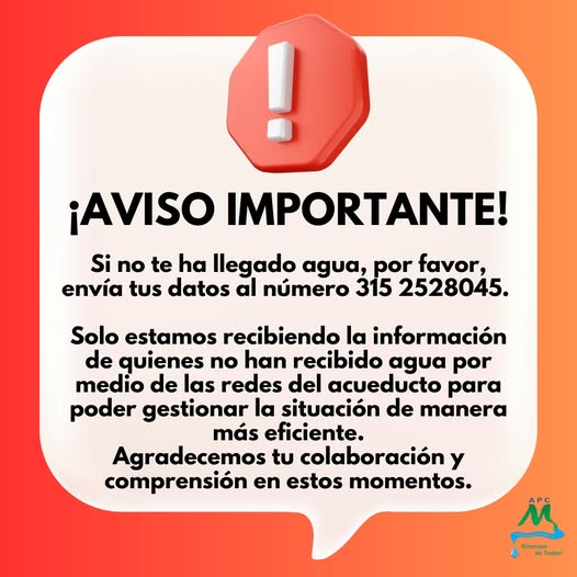 Si no te ha llegado agua, por favor, envía la dirección de tu vivienda al número 315 2528045, línea de atención al usuario.
