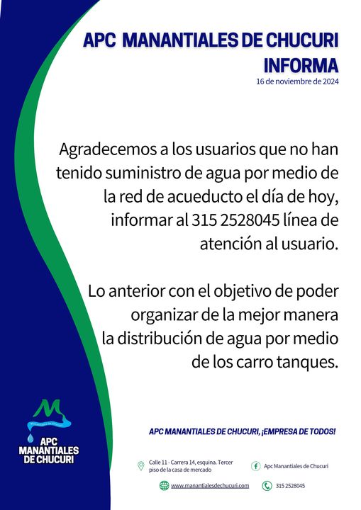 Agradecemos a los usuarios que no han tenido suministro de agua por medio de la red informar.