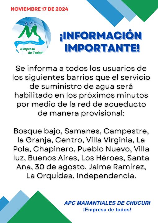 SUMINISTRO PROVISIONAL DE AGUA POR MEDIO DE LA RED DE ACUEDUCTO DE LOS BARRIOS: Bosque bajo, Samanes, Campestre, la Granja, Centro, Villa Virginia, La Pola, Chapinero, Pueblo Nuevo, Villa luz, Buenos Aires, Los Héroes, Santa Ana, 30 de agosto, Jaime Ramírez, La Orquídea, Independencia.