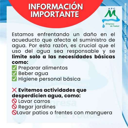 Estamos enfrentando un daño en el acueducto que afecta el suministro de agua. Por esta razón, es crucial que el uso del agua sea responsable y se limite solo a las necesidades básicas