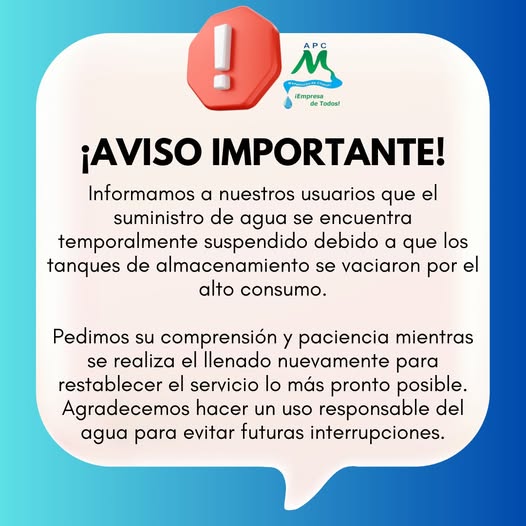 Informamos a la comunidad que el servicio de suministro de agua se encuentra temporalmente suspendido debido a que los tanques se vaciaron por el alto consumo