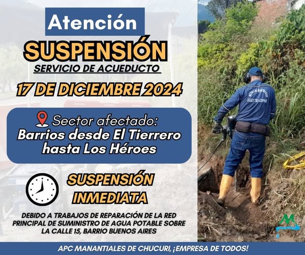 SUSPENSIÓN TEMPORAL DEL SERVICIO DE ACUEDUCTO 17 diciembre, 2024 Auxiliar Administrativo Noticias, Programas Sector Afectado: Barrio BUENOS AIRES. Fecha: 17 de diciembre de 2024.Horario: Inmediata.Motivo: Reparación en la red de distribución de agua potable sobre la calle 15, iniciando la Avenida del Cacao. APC Manantiales de Chucurí, Empresa de todos.#acueducto #alcantarillado #aseo