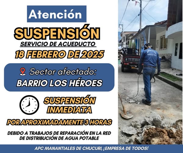 SUSPENSIÓN TEMPORAL DEL SERVICIO DE ACUEDUCTO 18 febrero, 2025 Auxiliar Administrativo Noticias Sector Afectado: BARRIO LOS HÉROES. Fecha: 18 de febrero de 2025.Horario: Inmediata.Motivo: DEBIDO A TRABAJOS DE REPARACIÓN EN LA RED DE DISTRIBUCIÓN DE AGUA POTABLE. APC Manantiales de Chucurí, Empresa de todos.#Acueducto #alcantarillado #aseo